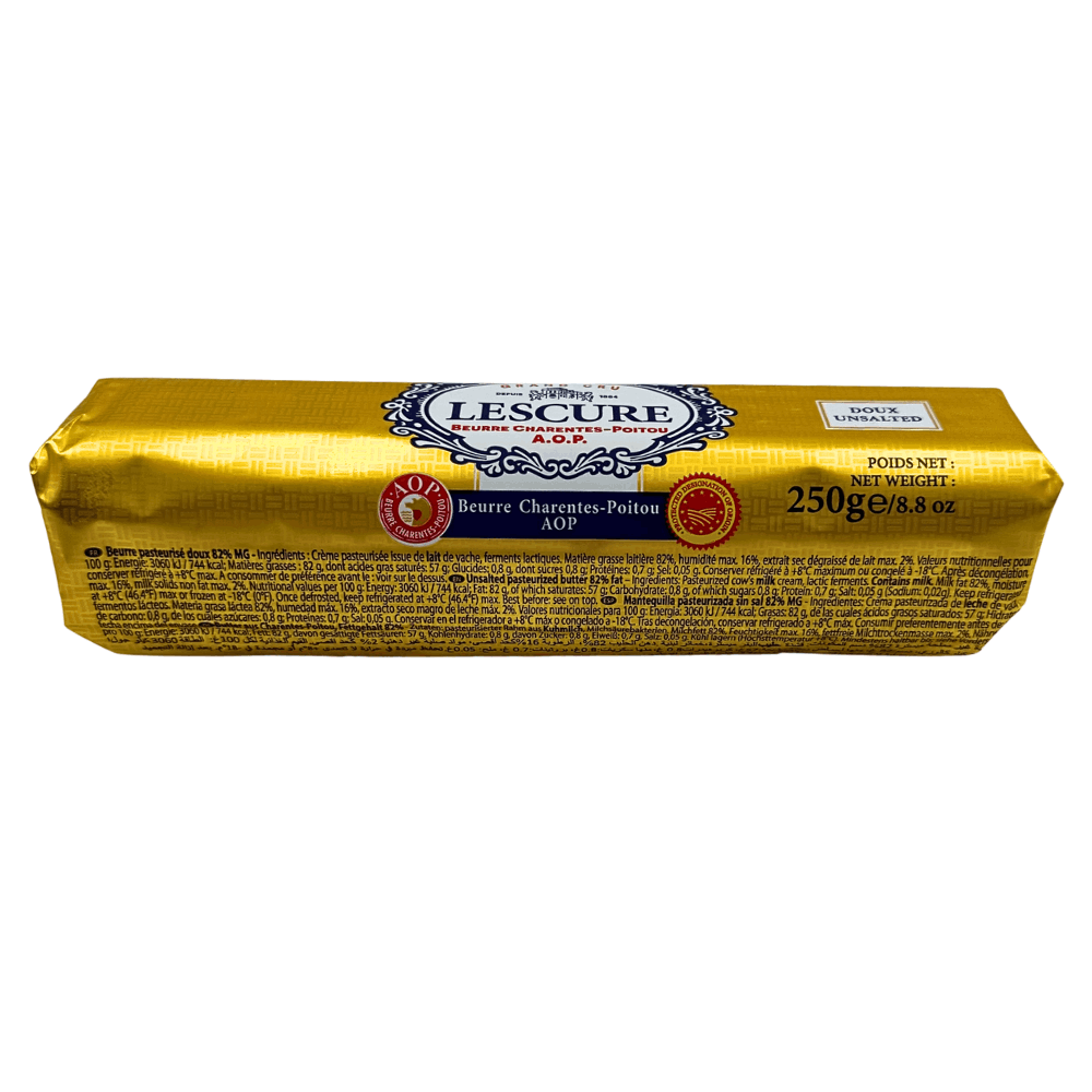 Indulge in the creamy excellence of Lescure unsalted butter PDO 250g, a premium French butter crafted in the heart of the Charentes-Poitou region. Made from high-quality French cream, this unsalted butter carries the prestigious PDO (Protected Designation of Origin, known as AOP in France) label, guaranteeing authentic regional origin and time-honoured artisanal methods.
