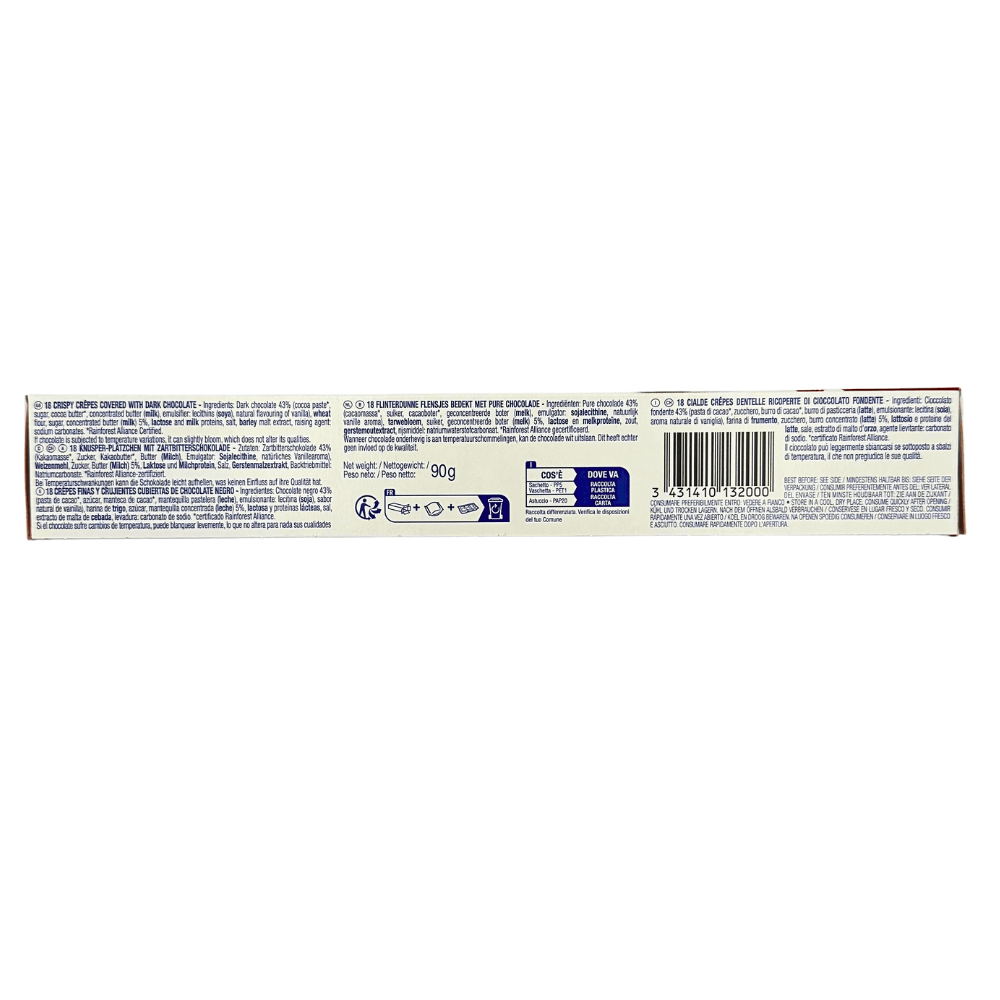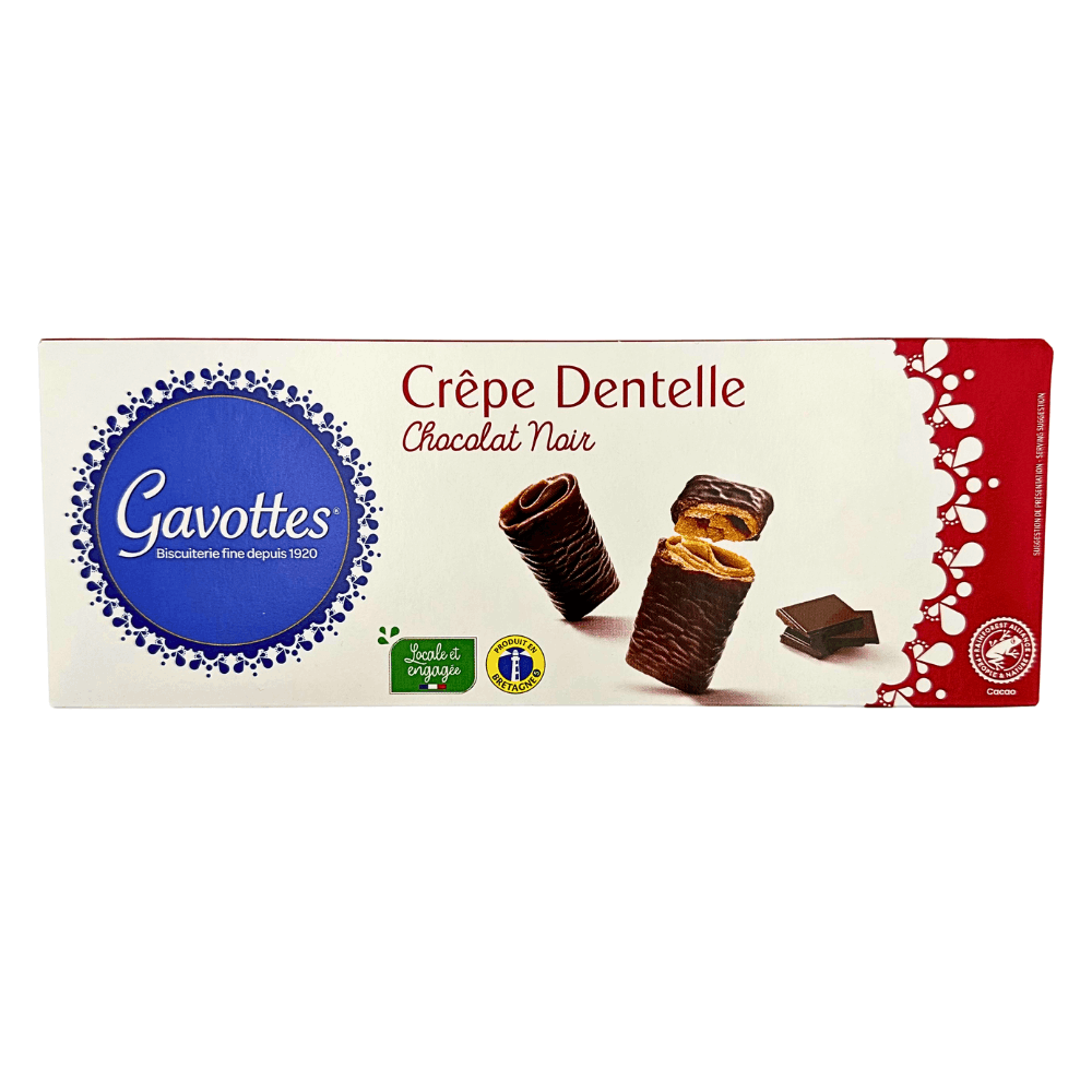 Indulge in the delicate crispiness of Gavottes crepe dentelle with dark chocolate. These signature crepe dentelles are crafted in Brittany, France, following a time-honoured recipe for irresistibly light and flaky layers. Each golden, lace-thin biscuit is carefully rolled and coated in rich, velvety dark chocolate for a perfect balance of crunch and indulgence.